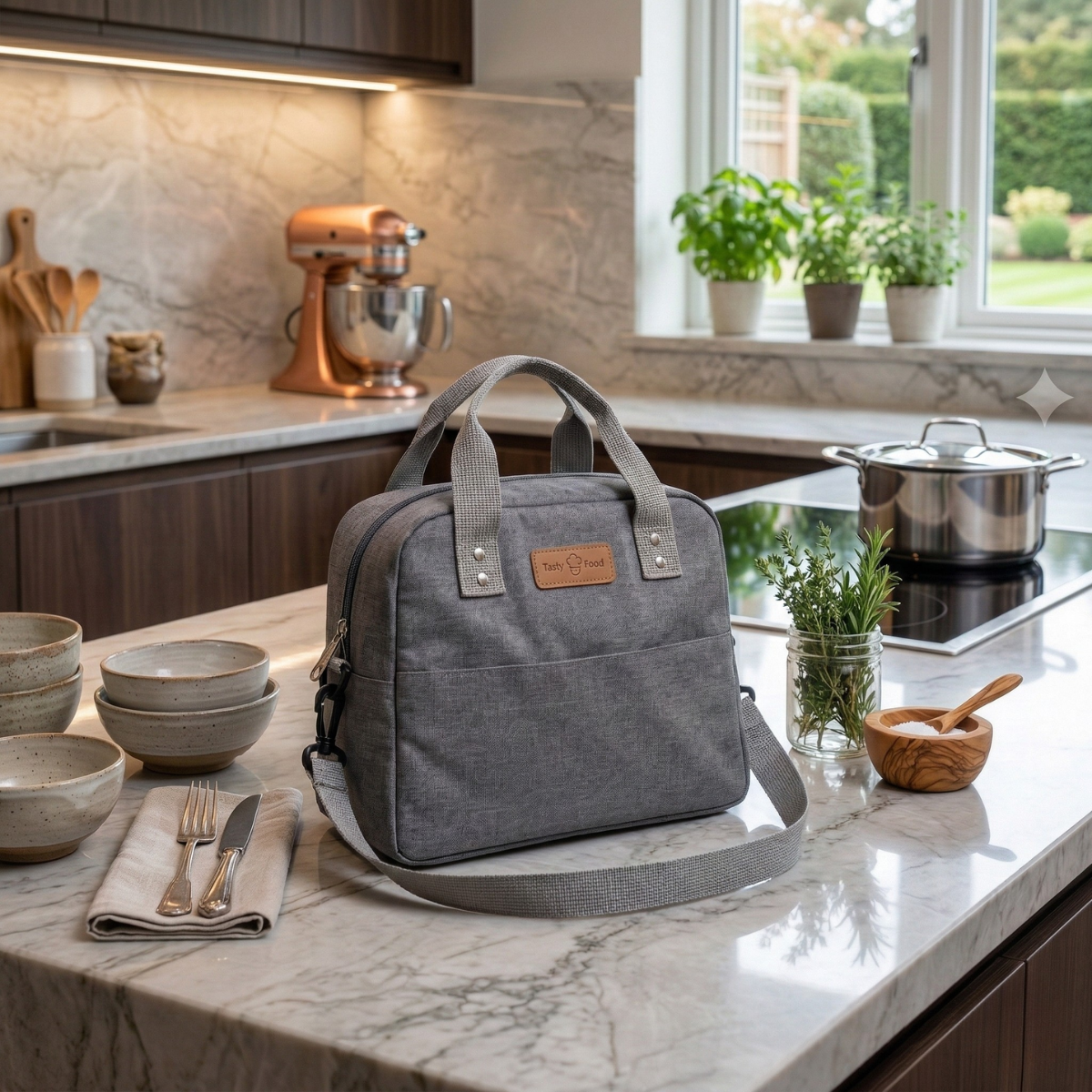 A Bolsa Térmica Luxo combina praticidade, estilo e conservação de temperatura em um único acessório. Feita em tecido resistente na cor cinza mesclado, apresenta um design minimalista e moderno, com duas alças curtas reforçadas por rebites metálicos. Na parte frontal, a etiqueta em couro sintético com o tema “Tasty Food” traz charme e personalidade ao produto.